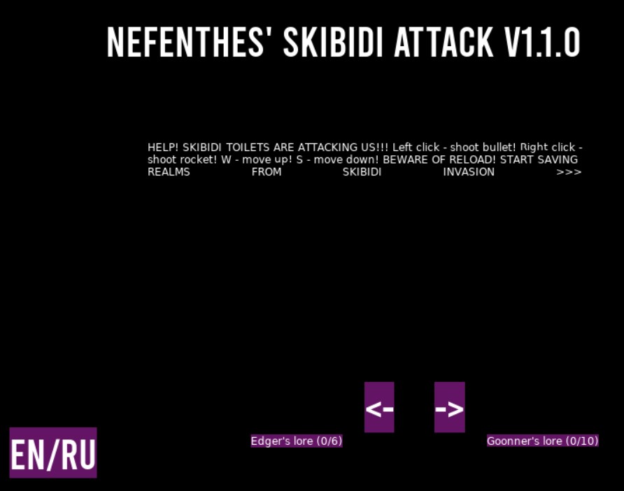 Download a zip archive. Unpack it in the directory where you want it, and doubleclick the "Skibidi Attack.exe" file. Feel free to change game resources however you want it's up to you.
